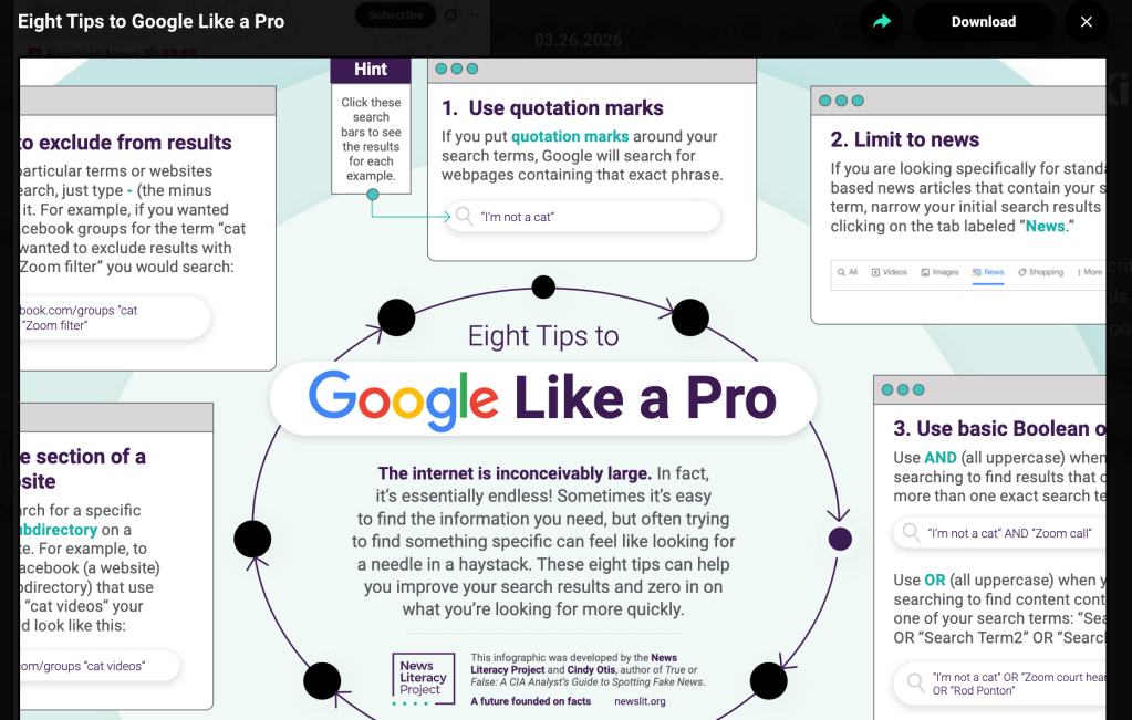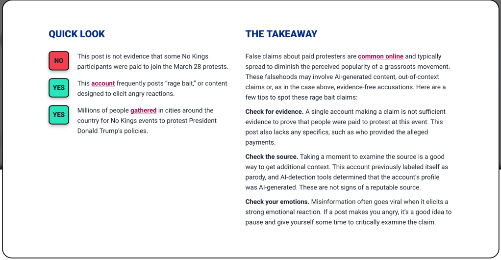 While interacting with “Rumor Guard” I learned that it is a wonderful tool that breaks down viral claims to show you why they are either factual or inaccurate. This tool utilizes real-time examples of misinformation, and emphasizes the importance of finding sufficient evidence to back up the claim(s), checking to see whether or not the claim is attached to a reputable site, and making sure to remove one’s personal emotions from the information in order to avoid clouded judgment. In order to use it, I simply clicked on one of the various claims that were listed, and then pressed “Learn More”. An in-depth explanation of what to look for to detect misinformation, and in some cases, how to check to see where information taken out of context originally came from was provided on the following page. This tool really teaches you to pay critical attention to the information that is presented to you. Oftentimes misinformation thrives because of a lack of researching and actually trying to confirm that various claims are indeed true. Making assumptions based off of emotional appeal or simply operating carelessly by believing any and everything you are exposed to are two of the many reasons misinformation continues to grow in society. This tool teaches you that there is a grave responsibility amongst us all to analyze, evaluate, and verify information before we accept it ourselves or share it with others.