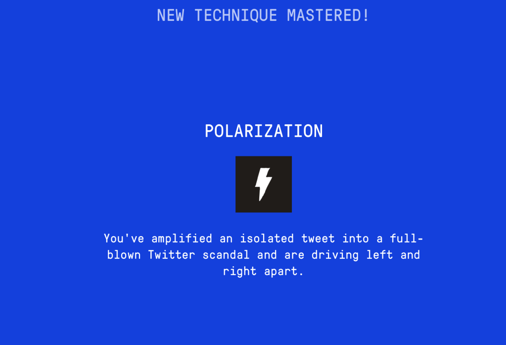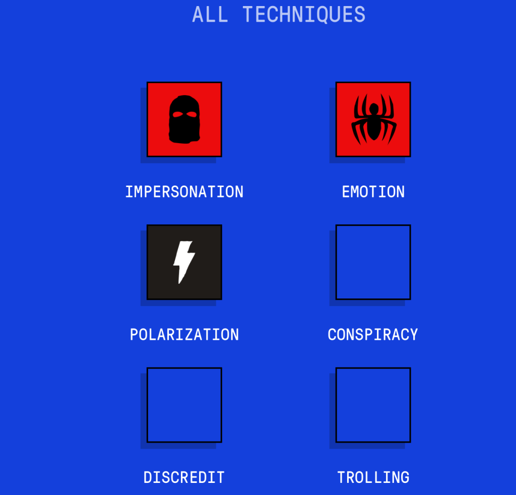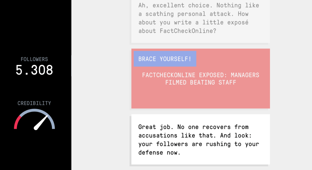 I actually played both “Fake it to Make it” and “Bad News”, but I chose to focus on the latter. “Bad News” is an online game that immerses you into a world of creating misinformation and disinformation. Essentially, I was the creator of either a news site or a blog that only posted misinformation as its content. The more striking the false information was, the farther it would spread, and I would gain a significant amount of followers in return. There were six different techniques highlighted throughout the game that could be utilized to keep people misinformed and keep them held up in a delusion. There were choices associated with each new scenario, but if the story, headline, or claim was not grand enough, it would cause your followers to get upset or possibly consider separating themselves from your site/blog. This game teaches you about the various strategies that exist when it comes to bringing misinformation into media spaces, but it also shows you what to look for in terms of misinformation, so you can not only help prevent the spread of it, but avoid being manipulated by it whenever you are exposed to it.