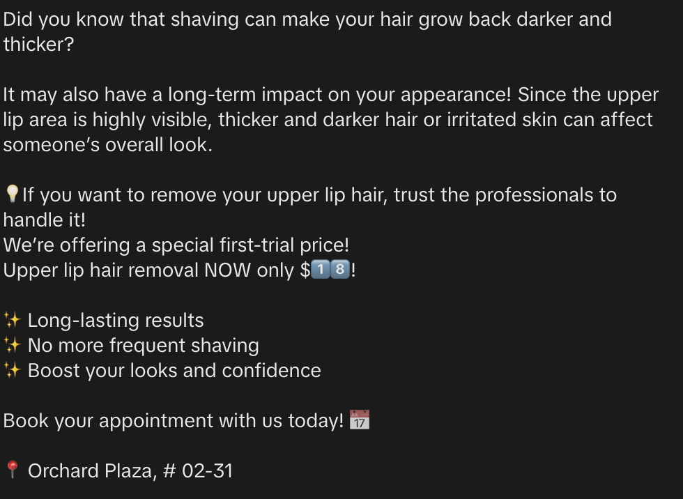 When going back to the original claim, it is clear that the motivation behind it may be to deceive and gain something. The presence of “Trust the professionals” and “Book an appointment today” make the intent of the post seem to be promotional driven. This post essentially tries to convince its audience that if they do not book with the brand, they will continue to endure the “hair complications” that come from shaving. People’s personal experiences and perceptions about their hair growing back coarser or darker after shaving, alongside this advertisement, can further push an audience to believe and act on what they are seeing. This post spreads misinformation just to lure in new clients rather than providing factual information which is extremely manipulative. It is more than possible to promote your brand without encouraging fear or concern over something which essentially deceives and influences people’s habits or decision-making.