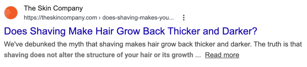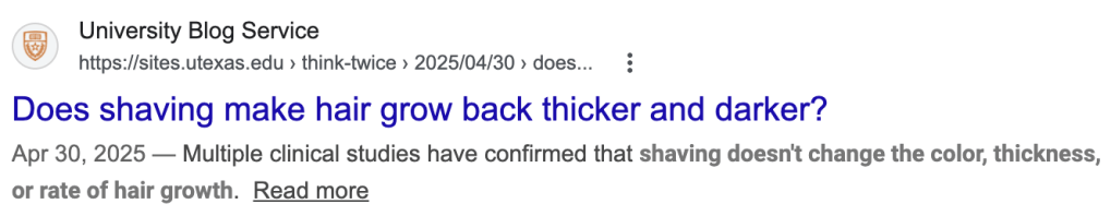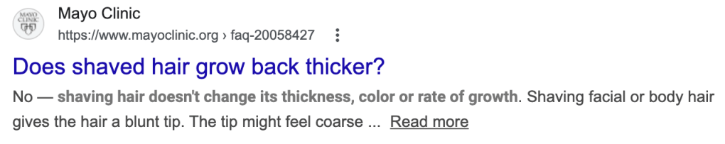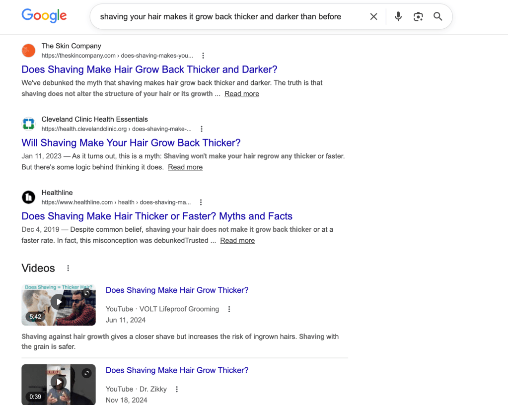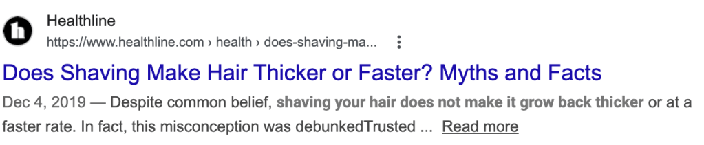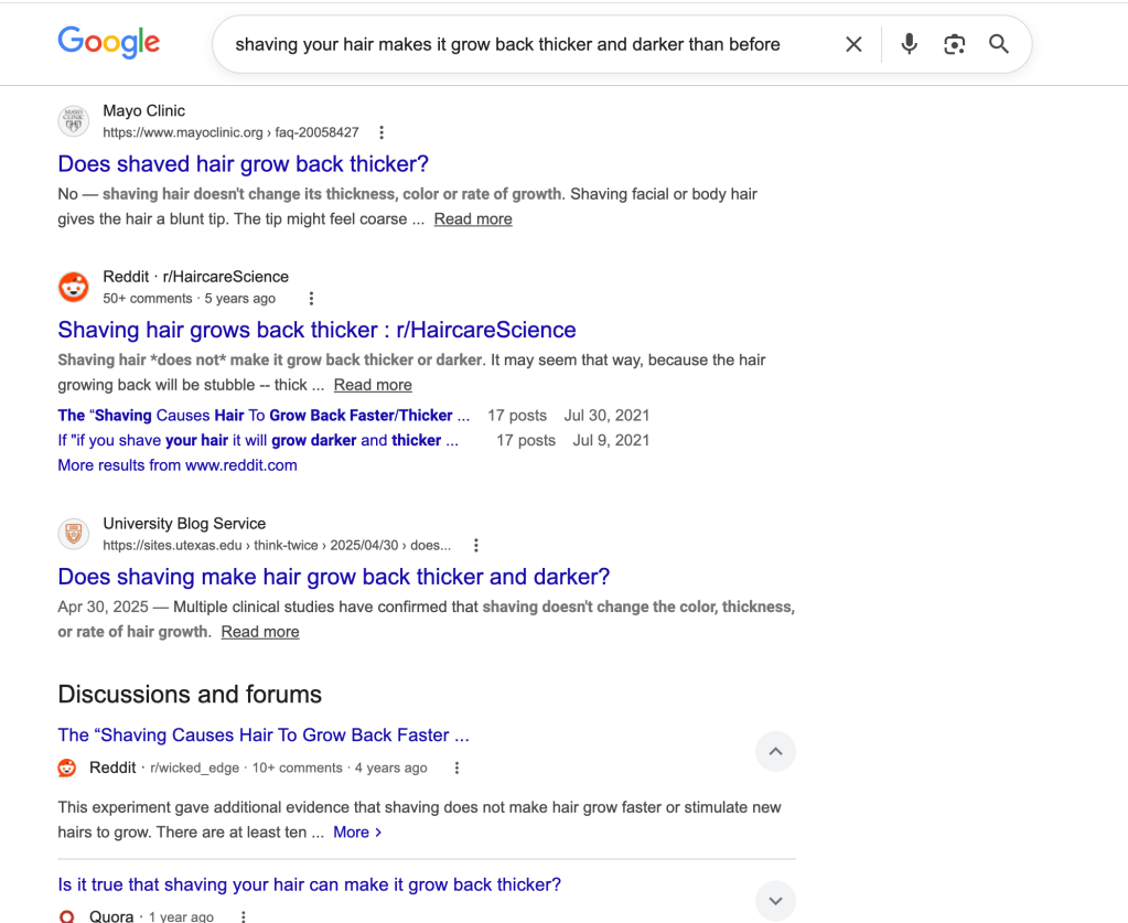 I decided to investigate with a simple search. I typed into my Google search engine “Shaving your hair makes it grow back thicker and darker than before”. I wanted to see what variety of articles and sources existed on this specific topic.