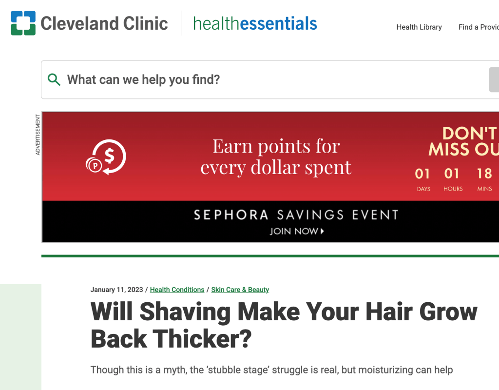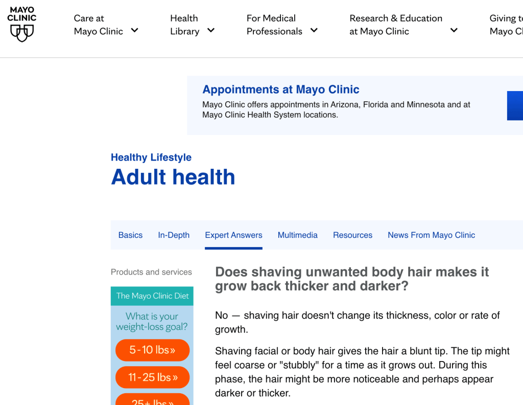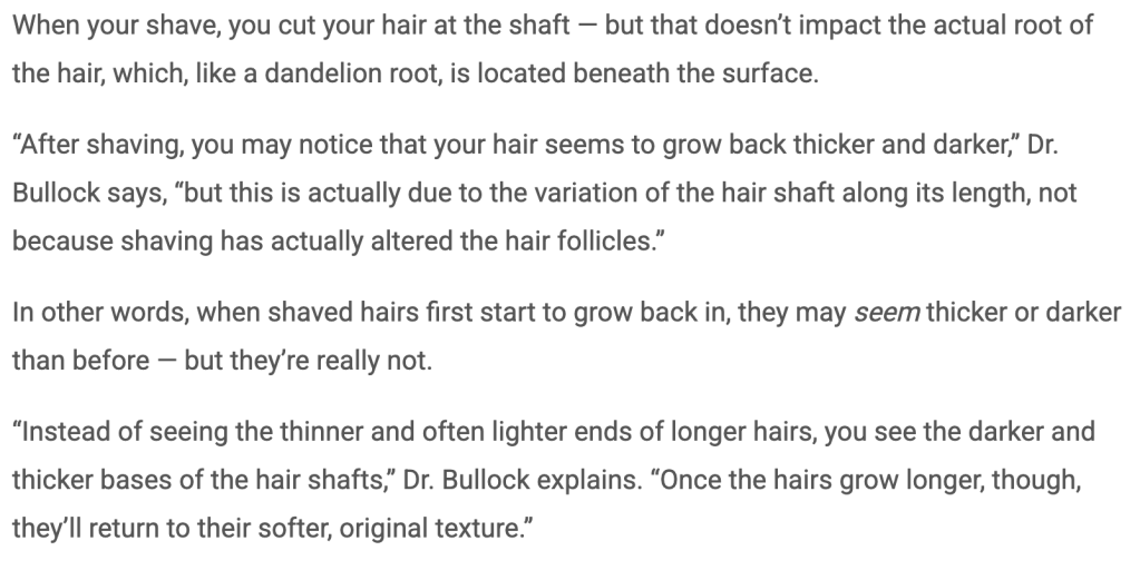 One article from Typology talked about a study published in the Journal of Cosmetic Dermatology that was conducted to see if there was a bigger difference in “thickness, color, and growth rate” of the hair follicle when hair was shaved or cut with a pair of scissors. This article highlighted that the study did not find any drastic differences between the two methods, making the original claim appear to be false. Not only did the Mayo Clinic article support this, but another reputable medical source known as the Cleveland Clinic did as well. It featured a dermatology resident by the name of Taylor Bullock, MD who talked in depth about why the claim is false, as well as reasons why the claim may feel true.